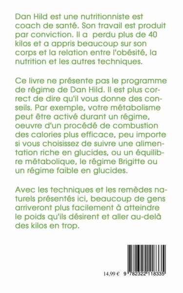 Ce livre ne présente pas le programme de régime de Dan Hild. Il est plus correct de dire qu'il vous donne des conseils. Par exemple, votre métabolisme peut être activé durant un régime, oeuvre d'un procédé de combustion des calories plus efficace, peu importe si vous choisissez de suivre une alimentation riche en glucides, ou un équilibre métabolique, le régime Brigitte ou un régime faible en glucides.