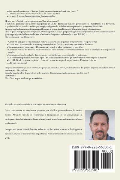 Êtes-vous tellement immergé dans vos pensées que vous risquez parfois de vous y noyer ? La rumination mentale vous écrase-t-elle la tête comme un étau ? Les soucis, le stress et l'anxiété sont-ils un fardeau quotidien ? Mettez-vous à l'abri de cette tempête avant qu'il ne soit trop tard ! Il faut savoir que l'incapacité à contrôler ses pensées est à la base de maladies mentales graves comme la schizophrénie et la dépression, et que la corrélation entre les troubles psychologiques légers et les maladies neurodégénératives précoces est bien établie. Le symptôme le plus commun à tous ces problèmes est la surpensée et l'incapacité à faire taire l'esprit volontairement. Dans ce guide pratique, je condense plus de 20 ans d'expérience en tant que psychologue judiciaire pour vous donner les meilleurs outils qui vous protégeront brillamment lorsque le bruit mental dépassera les bornes (si ce n'est déjà fait) ... Plus précisément, vous découvrirez :Comment éradiquer le virus mental en 3 étapes faciles : vaincre les pensées compulsives une fois pour toutes Le seul secret pour arrêter les pensées négatives et éliminer l'anxiété : applicable en seulement 5 minutes Comment nettoyer votre esprit : débarrasser votre tête de la saleté rapidement et sans effort Comment prendre des décisions pour votre réussite en un instant : découvrez la corrélation entre la suranalyse et les inquiétudes inutiles Comment arrêter d'avoir la tête dans les nuages : être totalement présent dans l'ici et maintenant Les 7 outils indispensables pour votre esprit : des techniques et des actions qui transformeront votre vie pour le meilleur Les 13 habitudes pour une vie pleine et épanouie : vous serez surpris de ne pas les avoir découvertes plus tôt ... Et bien plus encore ! Imaginez maintenant que vous reveniez à l'époque où vous étiez enfant, où l'interférence des pensées négatives et du bruit mental n'existait pas... Merveilleux Et quelle serait la valeur de pouvoir vivre des moments d'insouciance avec les personnes que l'on aime ? Inestimable ! Alors faites un pas vers la vie que vous désirez...
