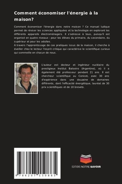 Comment économiser l'énergie dans notre maison ? Ce manuel ludique permet de réviser les sciences appliquées et la technologie en explorant les différents appareils électroménagers. Il s'adresse à tous, puisqu'il est organisé en quatre niveaux : pour les élèves du primaire, du secondaire, du supérieur et pour les adultes.À travers l'apprentissage de cas pratiques issus de la maison, il cherche à éveiller chez le lecteur l'esprit critique qui caractérise le scientifique curieux qui sommeille en chacun de nous.