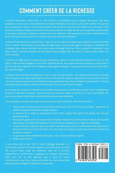 La liberté financière semble être un rêve lointain et irréalisable pour la plupart des gens, mais pour quelqu'un comme vous, cela semble être un objectif réaliste. Vous savez que tout le monde n'est pas fait pour la grandeur, mais ce club exclusif semble être l'endroit exact où vous deviez vous retrouver. L'état d'esprit, la liberté et l'épanouissement sont synonymes de vos objectifs de vie, et vous êtes prêt à utiliser le processus étape par étape pour donner vie à ces objectifs. C'est pourquoi vous avez décidé de lire ce livre, et je vous assure que vous trouverez que c'est une bonne décision. La liberté financière est un objectif qui, croyez-le ou non, peut être atteint par absolument tout le monde. Avec la vision, l'état d'esprit et les objectifs appropriés, vous pouvez gagner, épargner et élaborer des stratégies pour laisser derrière vous votre propre héritage financier. Pour y parvenir, cependant, vous devez savoir comment exploiter et concentrer votre énergie afin de suivre un chemin bien défini vers votre réussite. Il existe une règle que les personnes qui réussissent suivent et que personne d'autre ne suit, et c'est grâce à elle qu'elles atteignent tous leurs objectifs de vie, alors que beaucoup d'autres se retrouvent à penser que leurs objectifs sont irréalistes. Cette règle est simple : ne pas réinventer la roue. À part cela, il n'y a pas de règles. Le chemin de la réussite est déjà tracé ; tout ce que vous devez faire, c'est l'emprunter avec votre propre sens du style. Vous devez apprendre à suivre ce chemin de manière à générer du succès dans votre vie, sans pour autant vous priver de la liberté et des expériences que vous souhaitez vraiment vivre. Tant que vous apprenez à suivre ce chemin correctement, c'est vous qui fixez les règles. Si ce mode de vie axé sur la liberté vous semble correspondre à vos attentes, prenez votre exemplaire de Comment créer de la richesse : Vivre la vie de ses rêves en créant le succès et en étant inarrêtable, afin que vous puissiez commencer à construire la vie que vous souhaitez. Voici quelques-uns des sujets que vous découvrirez dans Comment créer de la richesse : - L'état d'esprit nécessaire que vous devez avoir pour créer de la richesse (indice : personne ne deviendra jamais riche sans cet état d'esprit). - Le pouvoir de la vision et pourquoi la vision de la plupart des gens n'est jamais rien de plus qu'une chimère. - Pourquoi la gestion de vos finances est le meilleur moyen d'accumuler de la richesse, ainsi que les sept étapes de la liberté financière et la façon de les transformer en objectifs réalisables. - Le secret le plus important que vous devez connaître pour créer un actif productif de revenus qui vous permettra de vivre la vie dont vous rêvez (je suis toujours surpris que personne d'autre ne semble en parler !) - Ce que vous devez réellement faire pour créer une entreprise prospère. - Et bien plus encore ! Si vous êtes prêt à dire "OUI" à votre héritage financier et à commencer à vivre la vie pour laquelle vous savez que vous êtes fait, prenez votre copie de Comment créer de la richesse aujourd'hui et commencez à appliquer ces étapes nécessaires dans votre vie. Je vous garantis que si vous les suivez correctement, vous ferez vous aussi partie du club exclusif des personnes qui atteignent réellement la grandeur.