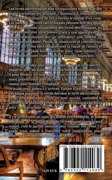 Les livres électroniques sont un équivalent numérique des livres cartonnés ou brochés. Convenant à chacun, cette façon révolutionnaire de lire a envahi le monde d'un coup. Les liseuses de livres électroniques peuvent être des appareils qui affichent uniquement des livres électroniques, ou elles peuvent être incorporées grâce à une application qui peut être téléchargée sur un ordinateur, une tablette ou même un téléphone. Pleins de ressources et commercialisables, les livres électroniques sont la vague de l'avenir et à l'aide d'une plate-forme ouverte pour l'autoédition, ils peuvent être votre chemin vers la réussite financière.Tout noyau d'idée peut être transformé en un livre électronique, et avec les bons outils et les bonnes connaissances, il peut devenir un best-seller. Mais comment faire ? Comment pouvez-vous aller de l'idée à la publication ? Le processus peut sembler compliqué, voire décourageant, mais ce guide vous aidera à y arriver. Faciles à lire et détaillées, ces pages exposent la vérité derrière le livre électronique ; ce qu'il faut pour en écrire un avec succès, comment le lancer, où le publier, et comment faire revenir les lecteurs pour votre prochain livre.Il y a un écrivain en vous qui attend d'être entendu, et avec le monde de la publication de livres numériques grand ouvert, c'est le parfait moment pour réaliser vos rêves. Ce guide vous aidera à travailler votre imagination pour créer un livre électronique qui se vend.