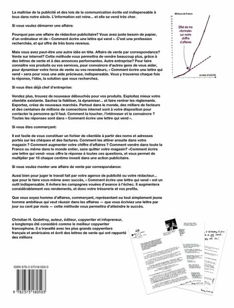 La maîtrise de la publicité et des lois de la communication écrite est indispensable à tous dans notre siècle. L'information est reine... et elle se vend très cher. Si vous voulez démarrer une affaire: Pourquoi pas une affaire de rédaction publicitaire? Vous avez juste besoin de papier, d'un ordinateur et de « Comment écrire une lettre qui vend ». C'est une profession recherchée, et qui offre de très bons revenus. Mais vous avez peut-être une autre idée en tête. Affaire de vente par correspondance? Vente sur internet? Cette méthode vous permettra de vendre beaucoup plus, grâce à des lettres de vente et à des annonces performantes. Autre entreprise? Pour faire connaître vos produits ou vos services, pour convaincre d'autres gens de vous aider, pour dynamiser votre force de vente ou vos revendeurs, « Comment écrire une lettre qui vend » sera pour vous une aide précieuse, indispensable. Vous y trouverez chaque fois la réponse, l'idée, la solution que vous recherchez. Si vous êtes déjà chef d'entreprise: Vendez plus, trouvez de nouveaux débouchés pour vos produits. Exploitez mieux votre clientéle existante. Sachez la fidéliser, la dynamiser... et faire rentrer les règlements. Exportez, créez de nouveaux marchés. Partout dans le monde, des milliers de facteurs et des centaines de millions de connections internet sont à votre disposition pour contacter la personne qu'il faut. Comment la toucher, l'intéresser et la convaincre ? Toutes les réponses sont dans « Comment écrire une lettre qui vend ». Si vous êtes commerçant: Il est facile de vous constituer un fichier de clientèle à partir des noms et adresses portés sur les chèques et des factures. Comment les attirer ensuite dans votre magasin ? Comment augmenter votre chiffre d'affaires ? Comment vendre dans toute la France ou même dans le monde entier, sans quitter votre magasin? «Comment écrire une lettre qui vend» vous offre la réponse à toutes ces questions, et vous permet de multiplier par 10 chaque centime investi dans une action publicitaire. Si vous voulez monter une affaire de vente par correspondance: Aussi bien pour juger le travail fait par votre agence de publicité ou votre rédacteur... que pour le faire vous-même avec succès, « Comment écrire une lettre qui vend » est un outil indispensable. Il évitera les campagnes vouées d'avance à l'échec. Il augmentera considérablement vos rendements, et donc votre trésorerie et vos profits.