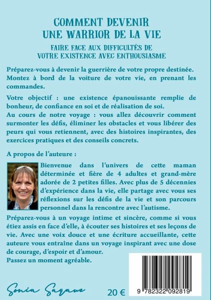Comment devenir une warrior de la vie.Faire face aux difficultés de votre existence avec enthousiasme.Préparez-vous à devenir la guerrière de votre propre destinée.Montez à bord de la voiture de votre vie, en prenant les commandes.Votre objectif : une existence épanouissante remplie de bonheur, de confiance en soi et de réalisation de soi.Au cours de notre voyage : vous allez découvrir comment surmonter les défis, éliminer les obstacles et vous libérer des peurs qui vous retiennent, avec des histoires inspirantes, des exercices pratiques et des conseils concrets.