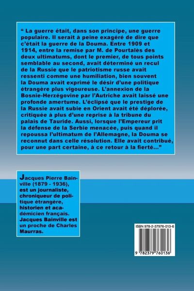 " La guerre était, dans son principe, une guerre populaire. Il serait à peine exagéré de dire que c’était la guerre de la Douma. Entre 1909 et 1914, entre la remise par M. de Pourtalès des deux ultimatums, dont le premier, de tous points semblable au second, avait déterminé un recul de la Russie que le patriotisme russe avait ressenti comme une humiliation, bien souvent la Douma avait exprimé le désir d’une politique étrangère plus vigoureuse. L’annexion de la Bosnie-Herzégovine par l’Autriche avait laissé une profonde amertume. L’éclipsé que le prestige de la Russie avait subie en Orient avait été déplorée, critiquée à plus d’une reprise à la tribune du palais de Tauride. Aussi, lorsque l’Empereur prit la défense de la Serbie menacée, puis quand il repoussa l’ultimatum de l’Allemagne, la Douma se reconnut dans celle résolution. Elle avait contribué, pour une part certaine, à ce retour à la fierté..."