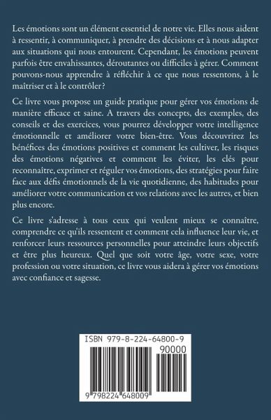 Les émotions sont un élément essentiel de notre vie. Elles nous aident à ressentir, à communiquer, à prendre des décisions et à nous adapter aux situations qui nous entourent. Cependant, les émotions peuvent parfois être envahissantes, déroutantes ou difficiles à gérer. Comment pouvons-nous apprendre à réfléchir à ce que nous ressentons, à le maîtriser et à le contrôler? Ce livre vous propose un guide pratique pour gérer vos émotions de manière efficace et saine. A travers des concepts, des exemples, des conseils et des exercices, vous pourrez développer votre intelligence émotionnelle et améliorer votre bien-être. Vous découvrirez les bénéfices des émotions positives et comment les cultiver, les risques des émotions négatives et comment les éviter, les clés pour reconnaître, exprimer et réguler vos émotions, des stratégies pour faire face aux défis émotionnels de la vie quotidienne, des habitudes pour améliorer votre communication et vos relations avec les autres, et bien plus encore. Ce livre s'adresse à tous ceux qui veulent mieux se connaître, comprendre ce qu'ils ressentent et comment cela influence leur vie, et renforcer leurs ressources personnelles pour atteindre leurs objectifs et être plus heureux. Quel que soit votre âge, votre sexe, votre profession ou votre situation, ce livre vous aidera à gérer vos émotions avec confiance et sagesse.