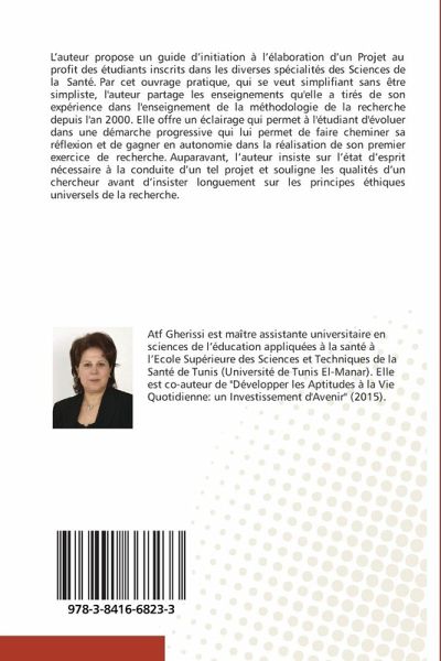 L'auteur propose un guide d'initiation à l'élaboration d'un Projet au profit des étudiants inscrits dans les diverses spécialités des Sciences de la Santé. Par cet ouvrage pratique, qui se veut simplifiant sans être simpliste, l'auteur partage les enseignements qu'elle a tirés de son expérience dans l'enseignement de la méthodologie de la recherche depuis l'an 2000. Elle offre un éclairage qui permet à l'étudiant d'évoluer dans une démarche progressive qui lui permet de faire cheminer sa réflexion et de gagner en autonomie dans la réalisation de son premier exercice de recherche. Auparavant, l'auteur insiste sur l'état d'esprit nécessaire à la conduite d'un tel projet et souligne les qualités d'un chercheur avant d'insister longuement sur les principes éthiques universels de la recherche.