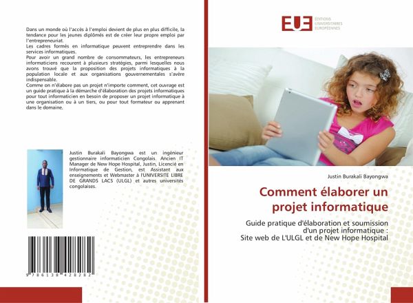 Dans un monde où l'accès à l'emploi devient de plus en plus difficile, la tendance pour les jeunes diplômés est de créer leur propre emploi par l'entrepreneuriat.Les cadres formés en informatique peuvent entreprendre dans les services informatiques.Pour avoir un grand nombre de consommateurs, les entrepreneurs informaticiens recourent à plusieurs stratégies, parmi lesquelles nous avons trouvé que la proposition des projets informatiques à la population locale et aux organisations gouvernementales s'avère indispensable.Comme on n'élabore pas un projet n'importe comment, cet ouvrage est un guide pratique à la démarche d'élaboration des projets informatiques pour tout informaticien en besoin de proposer un projet informatique à une organisation ou à un tiers, ou pour tout formateur ou apprenant dans le domaine.