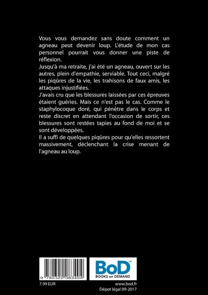 Vous vous demandez sans doute comment un agneau peut devenir loup. L'étude de mon cas personnel pourrait vous donner une piste de réflexion.Jusqu'à ma retraite, j'ai été un agneau, ouvert sur les autres, plein d'empathie, serviable. Tout ceci, malgré les piqûres de la vie, les trahisons de faux amis, les attaques injustifiées.J'avais cru que les blessures laissées par ces épreuves étaient guéries. Mais ce n'est pas le cas. Comme le staphylocoque doré, qui pénètre dans le corps et reste discret en attendant l'occasion de sortir, ces blessures sont restées tapies au fond de moi et se sont développées.Il a suffi de quelques piqûres pour qu'elles ressortent massivement, déclenchant la crise menant de l'agneau au loup.