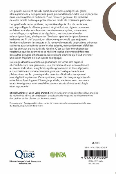 Les prairies couvrent près du quart des surfaces émergées du globe, et les graminées y occupent une place prépondérante. Outre leur importance dans les écosystèmes herbacés d'une manière générale, les individus de cette famille botanique présentent un mode de croissance particulier.L'originalité de cette synthèse, la première depuis plus de trente ans, est de privilégier le développement végétatif et ses règles communes en faisant état des nombreuses connaissances acquises, notamment sur le tallage, son rythme et sa régulation, les structures clonales et leur dynamique, ainsi que sur l'évolution spatiale des peuplements herbacés. Au fil de l'exposé, on découvre que c'est là que se jouent fondamentalement la structure et le renouvellement de végétations pérennes soumises aux contraintes du sol et des saisons, et régulièrement défoliées parles animaux ou les outils de récolte. C'est par leur morphogenèse végétative que les graminées se révèlent le plus clairement différentes des autres groupes d'herbacées. Et c'est sans doute là qu'il faut chercher une raison majeure de leur succès écologique.L'ouvrage décrit les caractères génériques de forme des organes et d'architecture des graminées, leur formation et leur renouvellement au niveau individuel, les rythmes qui les gouvernent et leurs réponses aux contraintes environnementales, puis les conséquences de ces phénomènes sur la dynamique des colonies d'individus composant une végétation pérenne. Cette synthèse, issue d'échanges approfondis entre l'écophysiologie et l'écologie prairiale, s'adresse aux chercheurs et aux enseignants, mais aussi directement aux étudiants en écologie et en agronomie.