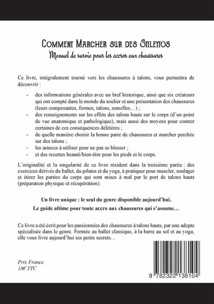 Ce livre, intégralement tourné vers les chaussures à talons, vous permettra de découvrir :- des informations générales avec un bref historique, ainsi que six créateurs qui ont compté dans le monde du soulier et une présentation des chaussures (leurs composantes, formes, talons, semelles...) ;- des renseignements sur les effets des talons hauts sur le corps (d'un point de vue anatomique et pathologique), mais aussi des moyens pour contrer certaines de ces conséquences délétères ;- de quelle manière choisir la bonne paire de chaussures et marcher perchée sur des talons ;- les astuces à utiliser pour ne pas se blesser ;- et des recettes beauté/bien-être pour les pieds et le corps.L'originalité et la singularité de ce livre résident dans la troisième partie : des exercices dérivés du ballet, du pilates et du yoga, à pratiquer pour muscler, soulager et étirer les parties du corps qui sont mises à mal par le port de talons hauts (préparation physique et récupération).Un livre unique : le seul du genre disponible aujourd'hui.Le guide ultime pour toute accro aux chaussures qui s'assume...