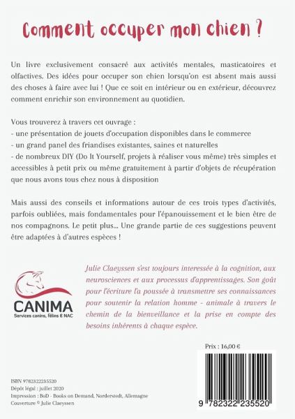 Un livre exclusivement consacré aux activités mentales, masticatoires et olfactives. Des idées pour occuper son chien lorsqu'on est absent mais aussi des choses à faire avec lui ! Que ce soit en intérieur ou en extérieur, découvrez comment enrichir son environnement au quotidien.Vous trouverez à travers ce livret une présentation de jouets d'occupation disponibles dans le commerce, un grand panel de friandises saines et naturelles, de nombreux DIY (Do It Yourself, projets à réaliser vous même) très simples et accessibles à petit prix ou même gratuitement à partir d'objets de récupération que nous avons tous chez nous à disposition !Mais aussi des conseils et informations autour de ces trois types d'activités, parfois oubliées, mais fondamentales pour l'épanouissement et bien être de nos compagnons.Le petit plus... Une grande partie de ses suggestions peuvent être adaptées à d'autres espèces !