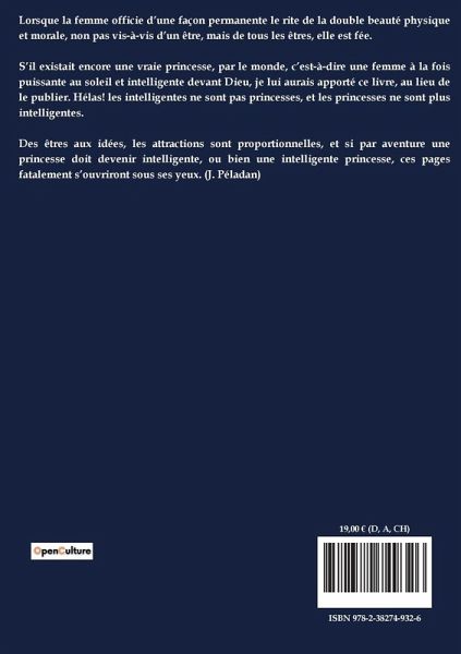 Lorsque la femme officie d¿une façon permanente le rite de la double beauté physique et morale, non pas vis-à-vis d¿un être, mais de tous les êtres, elle est fée. S¿il existait encore une vraie princesse, par le monde, c¿est-à-dire une femme à la fois puissante au soleil et intelligente devant Dieu, je lui aurais apporté ce livre, au lieu de le publier. Hélas! les intelligentes ne sont pas princesses, et les princesses ne sont plus intelligentes. Des êtres aux idées, les attractions sont proportionnelles, et si par aventure une princesse doit devenir intelligente, ou bien une intelligente princesse, ces pages fatalement s¿ouvriront sous ses yeux. (J. Péladan)