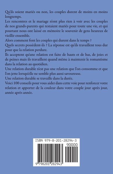 Qu'ils soient mariés ou non, les couples durent de moins en moins longtemps. Les rencontres et le mariage n'ont plus rien à voir avec les couples de nos grands-parents qui restaient mariés pour toute une vie, et qui pourtant nous ont laissé en mémoire le souvenir de gens heureux de vieillir ensemble. Alors comment font les couples qui durent dans le temps ? Quels secrets possèdent-ils ? La réponse est qu'ils travaillent tous dur pour que la relation perdure. Ils acceptent qu'une relation est faite de hauts et de bas, de joies et de peines mais ils travaillent quand même à maintenir le romantisme dans la relation au quotidien. Une relation durable n'est pas une relation que l'on consomme et que l'on jette lorsqu'elle ne semble plus aussi savoureuse. Une relation durable se travaille dans la durée. Voici 100 conseils pour vous aider dans cette voie pour renforcer votre relation et apporter de la couleur dans votre couple jour après jour, année après année.