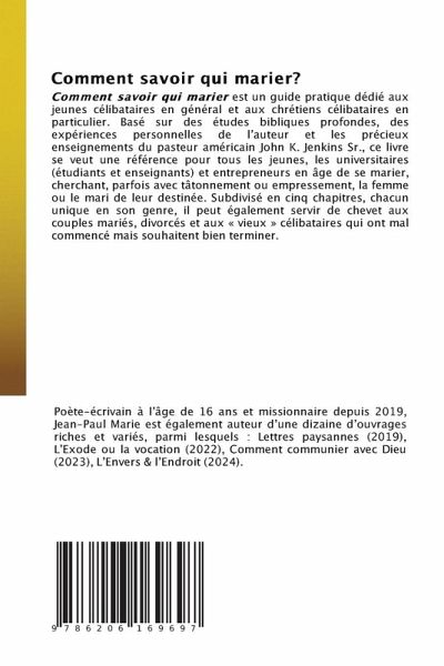 Comment savoir qui marier est un guide pratique dédié aux jeunes célibataires en général et aux chrétiens célibataires en particulier. Basé sur des études bibliques profondes, des expériences personnelles de l'auteur et les précieux enseignements du pasteur américain John K. Jenkins Sr., ce livre se veut une référence pour tous les jeunes, les universitaires (étudiants et enseignants) et entrepreneurs en âge de se marier, cherchant, parfois avec tâtonnement ou empressement, la femme ou le mari de leur destinée. Subdivisé en cinq chapitres, chacun unique en son genre, il peut également servir de chevet aux couples mariés, divorcés et aux « vieux » célibataires qui ont mal commencé mais souhaitent bien terminer.