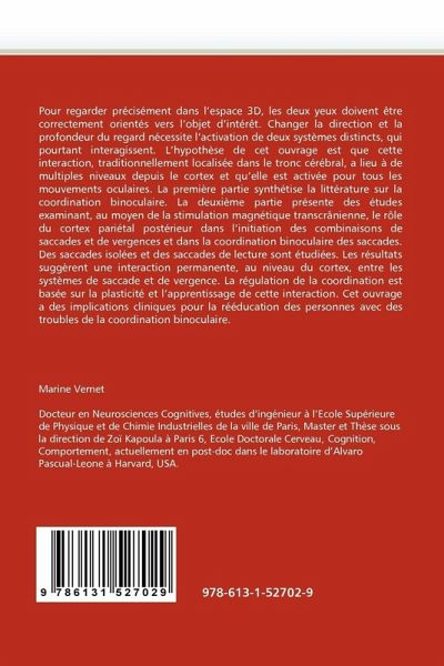 Pour regarder précisément dans l espace 3D, les deux yeux doivent être correctement orientés vers l objet d intérêt. Changer la direction et la profondeur du regard nécessite l activation de deux systèmes distincts, qui pourtant interagissent. L hypothèse de cet ouvrage est que cette interaction, traditionnellement localisée dans le tronc cérébral, a lieu à de multiples niveaux depuis le cortex et qu elle est activée pour tous les mouvements oculaires. La première partie synthétise la littérature sur la coordination binoculaire. La deuxième partie présente des études examinant, au moyen de la stimulation magnétique transcrânienne, le rôle du cortex pariétal postérieur dans l initiation des combinaisons de saccades et de vergences et dans la coordination binoculaire des saccades. Des saccades isolées et des saccades de lecture sont étudiées. Les résultats suggèrent une interaction permanente, au niveau du cortex, entre les systèmes de saccade et de vergence. La régulation de la coordination est basée sur la plasticité et l apprentissage de cette interaction. Cet ouvrage a des implications cliniques pour la rééducation des personnes avec des troubles de la coordination binoculaire.