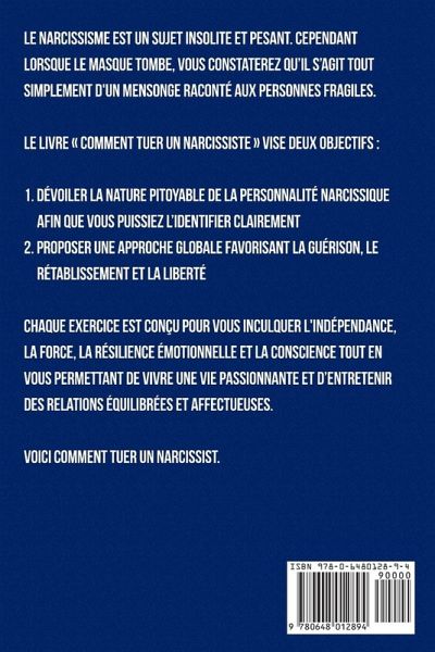 Le narcissisme est un sujet insolite et pesant. Cependant lorsque le masque tombe, vous constaterez qu'il s'agit tout simplement d'un mensonge raconté aux personnes fragiles. La manipulation narcissique est mise en uvre pour vous emprisonner dans une évidence déplorable. Elle ne disparait pas simplement parce que vous savez qu'elle existe. Le narcissiste instaure des comportements et des paradigmes chez sa cible qu'il faut changer profondément. Le livre Comment tuer un narcissiste vise deux objectifs : 1. Dévoiler la nature pitoyable de la personnalité narcissique afin que vous puissiez l'identifier clairement 2. Proposer une approche globale favorisant la guérison, le rétablissement et la liberté La même philosophie s'applique, aux parents, époux, épouses, amis, patrons ou collègues narcissiques. Après avoir lu Comment tuer un narcissiste vous serez capable de : - Prendre conscience des dégâts que les manipulations narcissiques ont provoqué sur votre psyché et quelles dispositions prendre pour guérir - Voir comment un narcissiste utilise l'humiliation comme arme pour vous rabaisser - Comprendre le terrain de jeu sur lequel les narcissistes prospèrent et comment ne pas y prendre part - Apprendre comment un narcissiste utilise le contrôle mental pour briser et reconstruire votre identité à des fins d'asservissement - Vous procurer des outils pour désarmer un narcissiste, c.-à-d. le priver de son approvisionnement narcissique - Examiner de plus près ; au-delà de la connaissance globale du trouble de la personnalité narcissique Comment tuer un narcissiste donne un aperçu instructif sur la dynamique entre un narcissiste et sa cible. À travers des explications approfondies, il décrit : - La façon dont nous devenons involontairement les cibles des narcissistes. - Le continuum de la honte/éminence et la façon dont le narcissiste l'utilise pour écraser votre confiance - La loi de l'éminence et la façon dont elle influence nos liens avec les personnes nombrilistes - L'effet du narcissisme sur sa cible y compris : un sentiment toxique de honte, une dissociation mentale et un ego fragilisé - Les entraves qui vous entraînent dans une spirale de manipulations narcissiques ; l'enclos psychologique, la privation d'affection, la faible tolérance à l'humiliation ainsi que la culpabilité et le conditionnement à l'indécence Grâce à une approche approfondie Comment tuer un narcissiste propose sept exercices favorisant la guérison et le rétablissement : 1. Nouer des amitiés : renforcez la confiance en soi grâce à une résonance dans la zone limbique du cerveau 2. Donner forme à son vrai soi : dévoilez les aspects reniés de soi et restaurez l'intégrité 3. Perfectionner les compétences : devenez autonome 4. Travailler les muscles : défiez l'enclos psychologique et sortez de votre zone de confort 5. Remettre la pendule à l'heure : restaurez l'équilibre dans vos relations 6. Définir les limites : installez une indépendance et protégez-la 7. La politique de la terre brûlée : éloignez-vous des personnes manipulatrices Chaque exercice est conçu pour vous inculquer l'indépendance, la force, la résilience émotionnelle et la conscience tout en vous permettant de vivre une vie passionnante et d'entretenir des relations équilibrées et affectueuses. Voici comment tuer un narcissist.