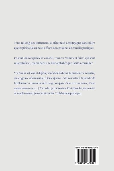 Tout au long des Entretiens, la Mère nous accompagne dans notre quête spirituelle en nous offrant des centaines de conseils pratiques. Ce sont tous ces précieux conseils, tous ces "comment faire" qui sont rassemblés ici, réunis dans une liste alphabétique facile à consulter. "Le chemin est long et difficile, semé d'embûches et de problèmes à résoudre, qui exige une détermination à toute épreuve. Cela ressemble à la marche de l'explorateur à travers la forêt vierge, en quête d'une terre inconnue, d'une grande découverte. (...) Pour celui qui est résolu à l'entreprendre, un nombre de simples conseils pourront être utiles." L'Éducation psychique.