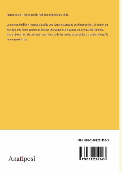 Réimpression inchangée de l'édition originale de 1868. La maison d'édition Anatiposi publie des livres historiques en réimpression. En raison de leur âge, ces livres peuvent présenter des pages manquantes ou une qualité moindre. Notre objectif est de préserver ces livres et de les rendre accessibles au public afin qu'ils ne se perdent pas.