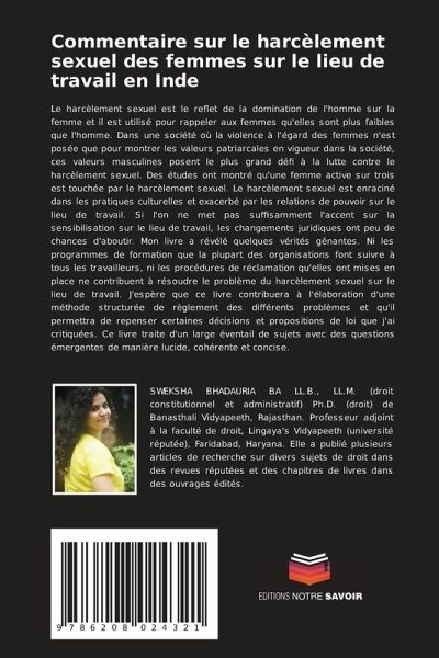 Le harcèlement sexuel est le reflet de la domination de l'homme sur la femme et il est utilisé pour rappeler aux femmes qu'elles sont plus faibles que l'homme. Dans une société où la violence à l'égard des femmes n'est posée que pour montrer les valeurs patriarcales en vigueur dans la société, ces valeurs masculines posent le plus grand défi à la lutte contre le harcèlement sexuel. Des études ont montré qu'une femme active sur trois est touchée par le harcèlement sexuel. Le harcèlement sexuel est enraciné dans les pratiques culturelles et exacerbé par les relations de pouvoir sur le lieu de travail. Si l'on ne met pas suffisamment l'accent sur la sensibilisation sur le lieu de travail, les changements juridiques ont peu de chances d'aboutir. Mon livre a révélé quelques vérités gênantes. Ni les programmes de formation que la plupart des organisations font suivre à tous les travailleurs, ni les procédures de réclamation qu'elles ont mises en place ne contribuent à résoudre le problème du harcèlement sexuel sur le lieu de travail. J'espère que ce livre contribuera à l'élaboration d'une méthode structurée de règlement des différents problèmes et qu'il permettra de repenser certaines décisions et propositions de loi que j'ai critiquées. Ce livre traite d'un large éventail de sujets avec des questions émergentes de manière lucide, cohérente et concise.