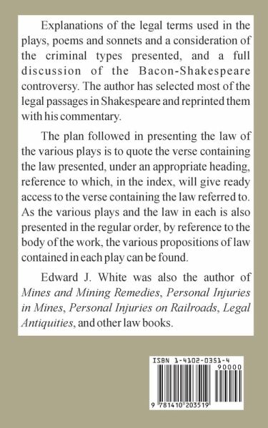 Explanations of the legal terms used in the plays, poems and sonnets and a consideration of the criminal types presented, and a full discussion of the Bacon-Shakespeare controversy. The author has selected most of the legal passages in Shakespeare and reprinted them with his commentary. The plan followed in presenting the law of the various plays is to quote the verse containing the law presented, under an appropriate heading, reference to which, in the index, will give ready access to the verse containing the law referred to. As the various plays and the law in each is also presented in the regular order, by reference to the body of the work, the various propositions of law contained in each play can be found. Edward J. White was also the author of Mines and Mining Remedies, Personal Injuries in Mines, Personal Injuries on Railroads, Legal Antiquities, and other law books.