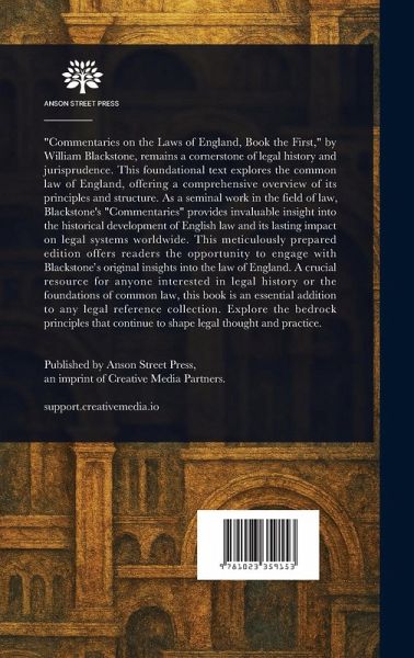 "Commentaries on the Laws of England, Book the First," by William Blackstone, remains a cornerstone of legal history and jurisprudence. This foundational text explores the common law of England, offering a comprehensive overview of its principles and structure. As a seminal work in the field of law, Blackstone's "Commentaries" provides invaluable insight into the historical development of English law and its lasting impact on legal systems worldwide. This meticulously prepared edition offers readers the opportunity to engage with Blackstone's original insights into the law of England. A crucial resource for anyone interested in legal history or the foundations of common law, this book is an essential addition to any legal reference collection. Explore the bedrock principles that continue to shape legal thought and practice. This work has been selected by scholars as being culturally important, and is part of the knowledge base of civilization as we know it. This work is in the public domain in the United States of America, and possibly other nations. Within the United States, you may freely copy and distribute this work, as no entity (individual or corporate) has a copyright on the body of the work. Scholars believe, and we concur, that this work is important enough to be preserved, reproduced, and made generally available to the public. We appreciate your support of the preservation process, and thank you for being an important part of keeping this knowledge alive and relevant.