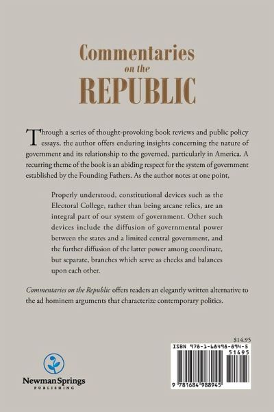 Through a series of thought-provoking book reviews and public policy essays, the author offers enduring insights concerning the nature of government and its relationship to the governed, particularly in America. A recurring theme of the book is an abiding respect for the system of government established by the Founding Fathers. As the author notes at one point, Properly understood, constitutional devices such as the Electoral College, rather than being arcane relics, are an integral part of our system of government. Other such devices include the diffusion of governmental power between the states and a limited central government, and the further diffusion of the latter power among coordinate, but separate, branches which serve as checks and balances upon each other. Commentaries on the Republic offers readers an elegantly written alternative to the ad hominem arguments that characterize contemporary politics.