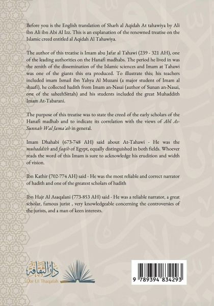 The author of this treatise is Imam abu Jafar al Tahawi (239 - 321 AH), one of the leading authorities on the Hanafi madhab. The period he lived in was the zenith of the dissemination of the Islamic sciences and Imam at Tahawi was one of the giants this era produced. To illustrate this; his teachers included Imam Ismail ibn Yahya Al Muzani (a major student of Imam al shaafi), he collected hadith from Imam an-Nasai (author of Sunan an-Nasai, one of the saheeh Sittah) and his students included the great Muhaddith Imam At-Tabarani. The purpose of this treatise was to state the creed of the early scholars of the Hanafi madhab and to indicate its correlation with the views of Ahl As-Sunnah Wal Jamaah in general. Imam Dhahabi (673-748 AH) said about At-Tahawi - He was the muhaddith and faqih of Egypt, equally distinguished in both fields. Whoever reads the word of this Imam is sure to acknowledge his erudition and width of vision. Ibn Kathir (702-774 AH) said - He was the most reliable and correct narrator of hadith and one of the greatest scholars of hadith. Ibn Hajr Al Asaqalani (773-853 AH) said - He was a reliable narrator, a great scholar , a famous jurist, very knowledgeable concerning the controversies of the jurists, and a man of keen interests.