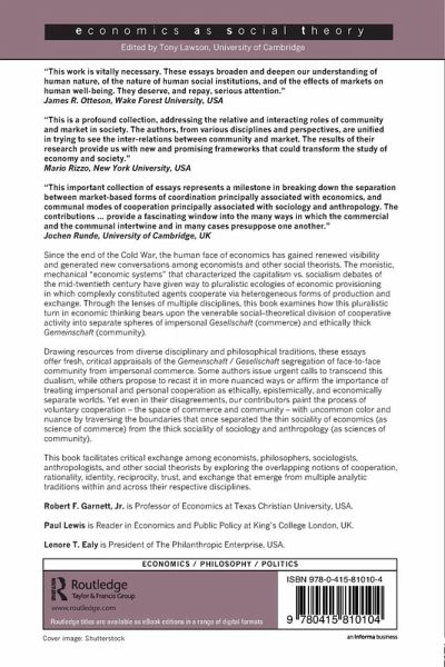 Since the end of the Cold War, the human face of economics has gained renewed visibility and generated new conversations among economists and other social theorists. The monistic, mechanical "economic systems" that characterized the capitalism vs. socialism debates of the mid-twentieth century have given way to pluralistic ecologies of economic provisioning in which complexly constituted agents cooperate via heterogeneous forms of production and exchange. Through the lenses of multiple disciplines, this book examines how this pluralistic turn in economic thinking bears upon the venerable social-theoretical division of cooperative activity into separate spheres of impersonal Gesellschaft (commerce) and ethically thick Gemeinschaft (community). Drawing resources from diverse disciplinary and philosophical traditions, these essays offer fresh, critical appraisals of the Gemeinschaft / Gesellschaft segregation of face-to-face community from impersonal commerce. Some authors issue urgent calls to transcend this dualism, whilst others propose to recast it in more nuanced ways or affirm the importance of treating impersonal and personal cooperation as ethically, epistemically, and economically separate worlds. Yet even in their disagreements, our contributors paint the process of voluntary cooperation - the space commerce and community - with uncommon color and nuance by traversing the boundaries that once separated the thin sociality of economics (as science of commerce) from the thick sociality of sociology and anthropology (as sciences of community). This book facilitates critical exchange among economists, philosophers, sociologists, anthropologists, and other social theorists by exploring the overlapping notions of cooperation, rationality, identity, reciprocity, trust, and exchange that emerge from multiple analytic traditions within and across their respective disciplines.