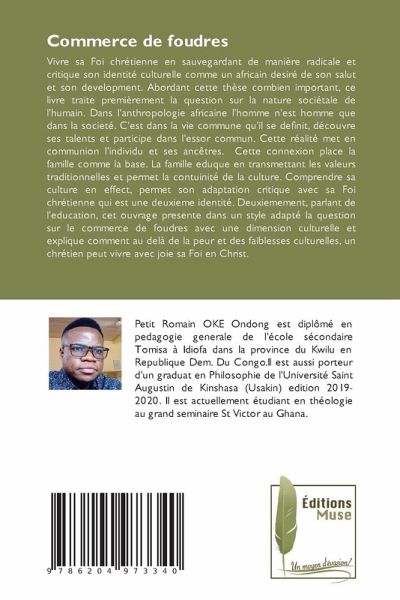 Vivre sa Foi chrétienne en sauvegardant de manière radicale et critique son identité culturelle comme un africain desiré de son salut et son development. Abordant cette thèse combien important, ce livre traite premièrement la question sur la nature sociétale de l'humain. Dans l'anthropologie africaine l'homme n'est homme que dans la societé. C'est dans la vie commune qu'il se definit, découvre ses talents et participe dans l'essor commun. Cette réalité met en communion l'individu et ses ancêtres. Cette connexion place la famille comme la base. La famille eduque en transmettant les valeurs traditionnelles et permet la contuinité de la culture. Comprendre sa culture en effect, permet son adaptation critique avec sa Foi chrétienne qui est une deuxieme identité. Deuxiemement, parlant de l'education, cet ouvrage presente dans un style adapté la question sur le commerce de foudres avec une dimension culturelle et explique comment au delà de la peur et des faiblesses culturelles, un chrétien peut vivre avec joie sa Foi en Christ.