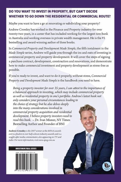 This book covers all things commercial: what to consider if buying a property to operate a business from, or buying a commercial property to lease out. It delves into development, subdivision, and how to improve a property. It may not just be residential property that you are interested in, so buying commercial property, what is involved, and relevant finance options are covered in great detail. While it is important to have a financially secure retirement, it is also about reaching a point in life, before retirement age, where you can have more choices to reduce your working hours, quit your job, or travel. It is about having hope, waking up every day, knowing you are doing everything you can to change your life for the better. Manufacturing cash flow and capital growth can potentially help you reach your goal quicker than sitting on a property for twenty years will. Whilst daily routine is good for most of us, it can be a comfort blanket we rely on. Having several routines other than just getting up, going to work, eating dinner, putting the kids to bed, and taking kids to their sports and activities is so important. It gives us hope that there is more out there that we may be able to accomplish. Within the commercial or industrial industries, very wealthy investors may own the premises where they run their business (often, wealthy people are self-employed). They may own some offices, or be involved in joint ventures with petrol stations, childcare centres, and aged care facilities or retirement villages. Commercial property is an important asset class within the asset sphere of property, so this book covers the many important considerations in relation to commercial property. these include, but are not limited to: capital growth, yield, necessary size of a deposit, what to consider when renting versus buying a premises for your business, different types of commercial property, and typical finance options. A successful investor’s residential portfolio may typically contain their principal place of residence, a holiday house or short- term holiday let, and potentially a couple of well-positioned properties in the capital cities down the Eastern seaboard of Australia. Remember, these investors are not successful because they were born with more knowledge; it is because they have advisors and they have a plan. Many people have the dilemma of deciding whether to move to another property, or to undertake an extension on their current property. Development, subdivisions, renovating for profit, building two or more dwellings on a block, and all the positives and risks associated with these invaluable strategies are explored within this book.