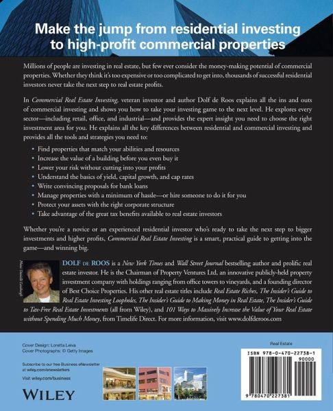 Make the jump from residential investing to high-profit commercial properties Millions of people are investing in real estate, but few ever consider the money-making potential of commercial properties. Whether they think it's too expensive or too complicated to get into, thousands of successful residential investors never take the next step to real estate profits. In Commercial Real Estate Investing, veteran investor and author Dolf de Roos explains all the ins and outs of commercial investing and shows you how to take your investing game to the next level. He explores every sector--including retail, office, and industrial--and provides the expert insight you need to choose the right investment area for you. He explains all the key differences between residential and commercial investing and provides all the tools and strategies you need to: * Find properties that match your abilities and resources * Increase the value of a building before you even buy it * Lower your risk without cutting into your profits * Understand the basics of yield, capital growth, and cap rates * Write convincing proposals for bank loans * Manage properties with a minimum of hassle--or hire someone to do it for you * Protect your assets with the right corporate structure * Take advantage of the great tax benefits available to real estate investors Whether you're a novice or an experienced residential investor who's ready to take the next step to bigger investments and higher profits, Commercial Real Estate Investing is a smart, practical guide to getting into the game--and winning big.