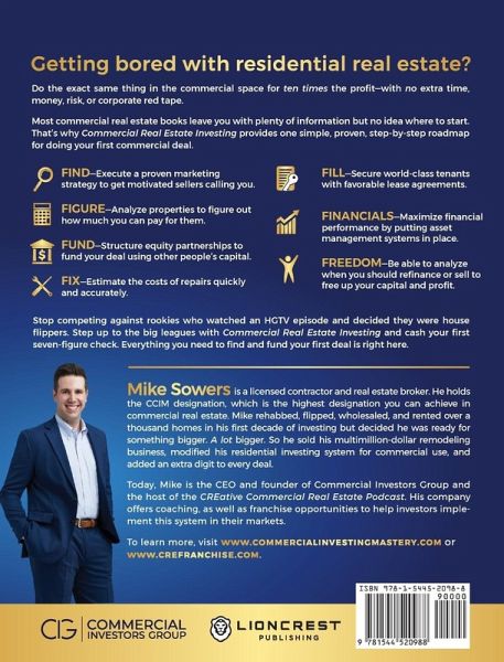 Getting bored with residential real estate? Do the exact same thing in the commercial space for ten times the profit-with no extra time, money, risk, or corporate red tape. Most commercial real estate books leave you with plenty of information but no idea where to start. That's why Commercial Real Estate Investing provides one simple, proven, step-by-step roadmap for doing your first commercial deal. FIND-Execute a proven marketing strategy to get motivated sellers calling you. FIGURE-Analyze properties to figure out how much you can pay for them. FUND-Structure an equity partnerships to fund your deal using other people's capital. FIX-Estimate the costs of repairs quickly and accurately. FILL-Secure world-class tenants with favorable lease agreements. FINANCIALS-Maximize financial performance by putting asset management systems in place. FREEDOM-Be able to analyze when you should refinance or sell to free up your capital and profit. Stop competing against rookies who watched an HGTV episode and decided they were house flippers. Step up to the big leagues with Commercial Real Estate Investing and cash your first seven-figure check. Everything you need to find and fund your first deal is right here.