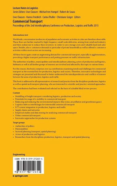 This contributed volume contains the selected and reviewed papers of the 2nd Interdisciplinary Conference on Production, Logistics and Traffic (ICPLT) 2015, Dortmund, Germany. The topical focus lies on economic, ecological and societal issues related to commercial transport. The authors are international experts and the paper collection presents the state-of-the-art in the field, thus making this book a valuable read for both practitioners and researchers.