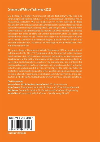 The proceedings of Commercial Vehicle Technology 2022 are a collection of publications for the 7th CVT Symposium of the Commercial Vehicle Alliance Kaiserslautern. As in previous years numerous submissions focusing on current developments in the field of commercial vehicles have been composed into an interesting and informative collection. The contributions are of interest for mechanical engineers, electrical engineers and computer scientists working in industry and academia and show the current state-of-the-art in this field. The contents of the publications span the topics assisted and automated driving and working, alternative propulsion technologies, innovative development and production methods, safety, reliability and durability as well as simulation methods.