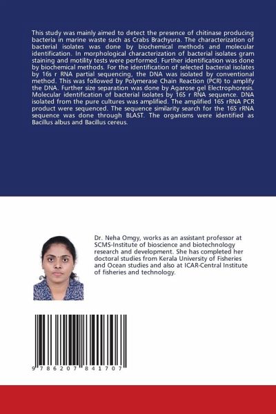 This study was mainly aimed to detect the presence of chitinase producing bacteria in marine waste such as Crabs Brachyura. The characterization of bacterial isolates was done by biochemical methods and molecular identification. In morphological characterization of bacterial isolates gram staining and motility tests were performed. Further identification was done by biochemical methods. For the identification of selected bacterial isolates by 16s r RNA partial sequencing, the DNA was isolated by conventional method. This was followed by Polymerase Chain Reaction (PCR) to amplify the DNA. Further size separation was done by Agarose gel Electrophoresis. Molecular identification of bacterial isolates by 16S r RNA sequence. DNA isolated from the pure cultures was amplified. The amplified 16S rRNA PCR product were sequenced. The sequence similarity search for the 16S rRNA sequence was done through BLAST. The organisms were identified as Bacillus albus and Bacillus cereus.