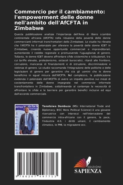 Questa pubblicazione analizza l'importanza dell'Area di libero scambio continentale africana (AfCFTA) nella riduzione della povertà delle donne commercianti informali transfrontalieri dello Zimbabwe. Lo studio ha rilevato che l'AfCFTA ha il potenziale per alleviare la povertà delle donne ICBT in Zimbabwe, creando nuove opportunità commerciali e imprenditoriali, aumentando il reddito regionale e promuovendo l'uguaglianza di genere. Tuttavia, le donne ICBT devono affrontare sfide sistemiche e istituzionali, tra cui tariffe elevate, protezionismo, ostacoli burocratici, ritardi alle frontiere, corruzione, mancanza di finanziamenti e di istruzione, discriminazione e violenza di genere. Lo studio raccomanda l'integrazione delle politiche e delle legislazioni di genere per garantire che sia gli uomini che le donne beneficino in egual misura dell'AfCFTA. Nel complesso, la pubblicazione evidenzia il potenziale dell'AfCFTA di avere un impatto positivo sui mezzi di sostentamento delle donne impegnate nel commercio informale transfrontaliero in Zimbabwe, sottolineando al contempo la necessità di affrontare le sfide e le barriere per garantire benefici inclusivi ed equi dall'accordo commerciale.