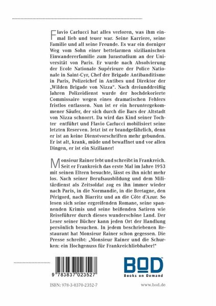 Flavio Carlucci hat alles verloren, was ihm einmal lieb und teuer war. Seine Karriere, seine Familie und all seine Freunde. Es war ein dorniger Weg vom Sohn einer bettelarmen sizilianischen Einwandererfamilie zum Jurastudium an der Universität von Paris. Er wurde nach Absolvierung der Ecole Nationale Superieure der Police Nationale in Saint-Cyr, Chef der Brigade Antibanditisme in Paris, Polizeichef in Antibes und Direktor der "Wilden Brigade von Nizza". Nach dreiunddreißig Jahren Polizeidienst wurde der hochdekorierte Commissaire wegen eines dramatischen Fehlers fristlos entlassen. Nun ist er ein heruntergekommener Säufer, der sich durch die Bars der Altstadt von Nizza schnorrt. Da wird das Kind seiner Tochter entführt und Flavio Carlucci mobilisiert seine letzten Reserven. Jetzt ist er brandgefährlich, denn er ist an keine Dienstvorschriften mehr gebunden. Er ist alt, krank, müde und bewaffnet und vorallendingen, er ist ein Sizilianer!