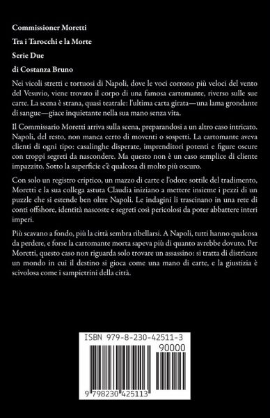 Commissioner Moretti Tra i Tarocchi e la Morte Serie Due di Costanza Bruno Nei vicoli stretti e tortuosi di Napoli, dove le voci corrono più veloci del vento del Vesuvio, viene trovato il corpo di una famosa cartomante, riverso sulle sue carte. La scena è strana, quasi teatrale: l'ultima carta girata-una lama grondante di sangue-giace inquietante nella sua mano senza vita. Il Commissario Moretti arriva sulla scena, preparandosi a un altro caso intricato. Napoli, del resto, non manca certo di moventi o sospetti. La cartomante aveva clienti di ogni tipo: casalinghe disperate, imprenditori potenti e figure oscure con troppi segreti da nascondere. Ma questo non è un caso semplice di cliente impazzito. Sotto la superficie c'è qualcosa di molto più oscuro. Con solo un registro criptico, un mazzo di carte e l'odore sottile del tradimento, Moretti e la sua collega astuta Claudia iniziano a mettere insieme i pezzi di un puzzle che si estende ben oltre Napoli. Le indagini li trascinano in una rete di conti offshore, identità nascoste e segreti così pericolosi da poter abbattere interi imperi. Più scavano a fondo, più la città sembra ribellarsi. A Napoli, tutti hanno qualcosa da perdere, e forse la cartomante morta sapeva più di quanto avrebbe dovuto. Per Moretti, questo caso non riguarda solo trovare un assassino: si tratta di districare un mondo in cui il destino si gioca come una mano di carte, e la giustizia è scivolosa come i sampietrini della città.