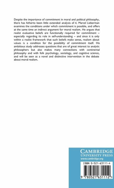 Despite the importance of commitment in moral and political philosophy, there has hitherto been little extended analysis of it. Marcel Lieberman examines the conditions under which commitment is possible, and offers at the same time an indirect argument for moral realism. He argues that realist evaluative beliefs are functionally required for commitment - especially regarding its role in self-understanding - and since it is only within a realist framework that such beliefs make sense, realism about values is a condition for the possibility of commitment itself. His ambitious study addresses questions that are of great interest to analytic philosophers but also makes many connections with continental philosophy and with folk psychology, sociology and cognitive science, and will be seen as a novel and distinctive intervention in the debate about moral realism.