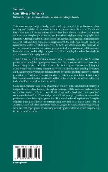 This book is designed to provide a unique, evidence-based perspective on Australia's parliamentary model of rights protection and on the experience of counter-terrorism law making in Australia since 2011. By focusing on the role and impact of the federal parliamentary committee system, this book offers a fresh perspective on the contemporary legal and political debate on the best legal mechanism for rights protection in Australia. By using counter-terrorism laws as a detailed case study, this book also contributes in a timely, authoritative way to the debate on balancing individual liberties with national security.