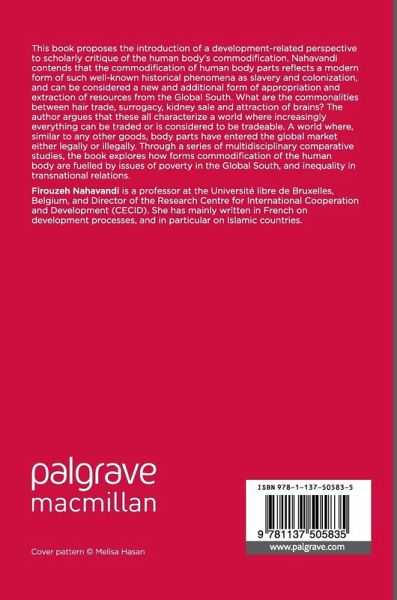 Thisbook proposes the introduction of a development-related perspective toscholarly critique of the human body's commodification. Nahavandi contends that the commodification of humanbody parts reflects a modern form of such well-known historical phenomena asslavery and colonization, and can be considered a new and additional form ofappropriation and extraction of resources from the Global South. Whatare the commonalities between hairtrade, surrogacy, kidney sale and attraction of brains? The author argues that these allcharacterize a world where increasingly everything can be traded or is consideredto be tradeable. A world where, similar to any other goods, body parts haveentered the global market either legally or illegally. Through a series ofmultidisciplinary comparative studies, the book explores how formscommodification of the human body are fuelled by issues of poverty in theGlobal South, and inequality in transnational relations.