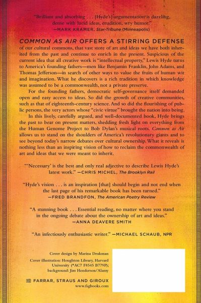Common as Air offers a stirring defense of our cultural commons, that vast store of art and ideas we have inherited from the past and continue to enrich in the present. Suspicious of the current idea that all creative work is "intellectual property," Lewis Hyde turns to America's Founding Fathers-men such as Adams, Madison, and Jefferson-in search of other ways to imagine the fruits of human wit and imagination. What he discovers is a rich tradition in which knowledge was assumed to be a commonwealth, not a private preserve. For the founders, democratic self-governance itself demanded open and easy access to ideas. So did the growth of creative communities such as that of eighteenth-century science. And so did the flourishing of public persons, the very actors whose "civic virtue" brought the nation into being. In this lively, carefully argued, and well-documented book, Hyde brings the past to bear on present matters, shedding fresh light on everything from the Human Genome Project to Bob Dylan's musical roots. Common as Air allows us to stand on the shoulders of America's revolutionary giants and thus to see beyond today's narrow debates over cultural ownership. What it reveals is nothing less than a vision of how to reclaim the commonwealth of art and ideas that we were meant to inherit.