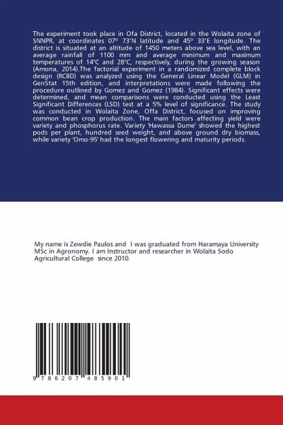The experiment took place in Ofa District, located in the Wolaita zone of SNNPR, at coordinates 07º 73'N latitude and 45º 33'E longitude. The district is situated at an altitude of 1450 meters above sea level, with an average rainfall of 1100 mm and average minimum and maximum temperatures of 14°C and 28°C, respectively, during the growing season (Amona, 2014).The factorial experiment in a randomized complete block design (RCBD) was analyzed using the General Linear Model (GLM) in GenStat 15th edition, and interpretations were made following the procedure outlined by Gomez and Gomez (1984). Significant effects were determined, and mean comparisons were conducted using the Least Significant Differences (LSD) test at a 5% level of significance. The study was conducted in Wolaita Zone, Offa District, focused on improving common bean crop production. The main factors affecting yield were variety and phosphorus rate. Variety 'Hawassa Dume' showed the highest pods per plant, hundred seed weight, and above ground dry biomass, while variety 'Omo-95' had the longest flowering and maturity periods.