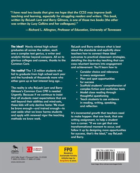 The ideal? Newly minted high school graduates all across the nation, each one a complex text genius, a writer and analytic thinker beyond compare. All on to glorious colleges and careers, thanks to the Common Core. The reality? The 1.3 million students who fail to graduate from high school each year and the hundreds of thousands more who either gave up or lost interest long ago . . . The reality is why Common Core CPR is needed. Urgently. Because if we continue to insist that all students meet expectations that are well beyond their abilities and mindsets, these kids will only decline faster. We must be brave enough-and trained enough-to cast aside what we know harms students and apply with renewed vigour the teaching methods we know work. Releah Lent and Barry Gilmore rise to the challenge, and there are no two authors better equipped to do so. They embrace what is best about the standards-their emphasis on active, authentic learning-and then explicitly show teachers how to connect these ideal outcomes to practical classroom strategies, detailing the day-to-day teaching that can coax reluctant learners into engagement and achievement. You'll learn how to: • Consider choice and relevance in every assignment • Plan and spot opportunities for success • Scaffold students' comprehension of complex fiction and nonfiction texts • Model close reading through thoughtful questioning • Teach students to use evidence in reading, writing, speaking, and reflection