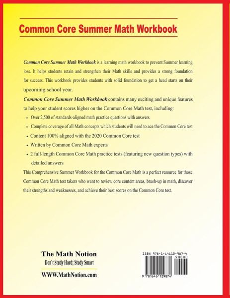 Prepare for the Common Core Math test with a perfect workbook! Common Core Summer Math Workbook is a learning math workbook to prevent Summer learning loss. It helps students retain and strengthen their Math skills and provides a strong foundation for success. This workbook provides students with solid foundation to get a head starts on their upcoming school year. Common Core Summer Math Workbook is designed by top test prep experts to help students prepare for the Common Core Math test. It provides test-takers with an in-depth focus on the math section of the test, helping them master the essential math skills that test-takers find the most troublesome. This is a prestigious resource for those who need an extra practice to succeed on the Common Core Math test in the summer. Common Core Summer Math Workbook contains many exciting and unique features to help your student scores higher on the Common Core Math test, including: * Over 2,500 of standards-aligned math practice questions with answers * Complete coverage of all Math concepts which students will need to ace the Common Core test * Content 100% aligned with the latest Common Core test * Written by Common Core Math experts * 2 full-length Common Core Math practice tests (featuring new question types) with detailed answers This Comprehensive Summer Workbook for the Common Core Math is a perfect resource for those Common Core Math test takers who want to review core content areas, brush-up in math, discover their strengths and weaknesses, and achieve their best scores on the Common Core test. Published By: The Math Notion www.mathnotion.com