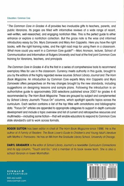 The Common Core in Grades 4-6 is the first in a series of comprehensive tools to tap into the vast flow of recently published books for children and teens, offering recommendations of exemplary titles for use in the classroom. Currency meets authority, brought to you by the editors of the highly regarded review sources, School Library Journal and The Horn Book Magazine. This guide includes approximately 200 selections published since 2007 for grades 4-6 recommended by The Horn Book Magazine. The titles are grouped by subject and complemented by School Library Journal's "Focus On" columns, which spotlight specific topics across the curriculum.