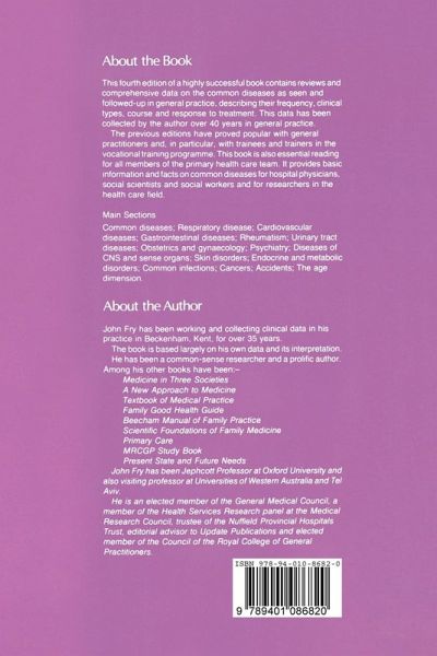 Section I Common Diseases.- 1 Introduction.- 2 What are the common diseases?.- 3 Who gets them, when, and what happens?.- 4 What goes on in practice?.- Section II Respiratory diseases.- 5 Respiratory diseases - the clinical spectrum.- 6 Acute upper respiratory infections and influenza.- 7 Catarrhal children.- 8 Acute otitis media.- 9 Acute throat infections.- 10 Glandular fever.- 11 Acute chest infections (bronchitis and pneumonia).- 12 Chronic bronchitis.- 13 Asthma.- 14 Hay fever.- 15 Cancer of the lung.- Section III Cardiovascular diseases.- 16 Cardiovascular diseases - the clinical spectrum.- 17 Ischaemic heart disease.- 18 High blood pressure.- 19 Cardiac failure.- 20 Varicose veins.- 21 Anaemias.- Section IV Gastro-intestinal diseases.- 22 Gastro-intestinal diseases - the clinical spectrum.- 23 Acute gastroenteritis.- 24 Functional disorders.- 25 Peptic ulcers.- 26 The 'acute abdomen'.- 27 Gall bladder, liver and pancreas.- 28 Cancers of the gastro-intestinal tract.- Section V Rheumatism.- 29 Rheumatism - the clinical spectrum.- 30 The 'acute back'.- 31 Rheumatoid arthritis.- 32 Osteoarthrosis.- 33 Non-articular and other forms of rheumatism.- Section VI Urinary tract diseases.- 34 Urinary tract diseases - the clinical spectrum.- 35 Acute urinary infections.- Section VII Obstetrics and gynaecology.- 36 Obstetrics and gynaecology - the clinical spectrum.- 37 Gynaecological disorders.- Section VIII Psychiatry.- 38 Psychiatry - the clinical spectrum.- 39 Emotional disorders in general - depression in particular.- Section IX Diseases of CNS and sense organs.- 40 Diseases of CNS and sense organs - the clinical spectrum.- 41 Migraine.- 42 Epilepsy and convulsions.- 43 Strokes.- Section X Skin disorders.- 44 Skin disorders - the clinicalspectrum.- Section XI Endocrine and metabolic disorders.- 45 Endocrine and metabolic disorders - the clinical spectrum.- 46 Diabetes.- 47 Thyroid disorders.- Section XII Common infections.- 48 Common infections - the clinical spectrum.- Section XIII Cancers.- 49 Cancers - the clinical spectrum.- 50 Cancer.- Section XIV Accidents.- 51 Accidents - the clinical spectrum.- Section XV The age dimension.- 52 Age - the clinical spectrum.- Section XVI Database.- 53 NHS Data.- References.- Further reading.