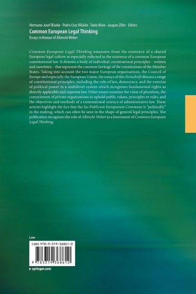 Common European Legal Thinking emanates from the existence of a shared European legal culture as especially reflected in the existence of a common European constitutional law. It denotes a body of individual constitutional principles - written and unwritten - that represent the common heritage of the constitutions of the Member States. Taking into account the two major European organisations, the Council of Europe and especially the European Union, the essays of this Festschrift discuss a range of constitutional principles, including the rule of law, democracy, and the exercise of political power in a multilevel system which recognises fundamental rights as directly applicable and supreme law. Other essays examine the value of pluralism, the commitment of private organisations to uphold public values, principles or rules, and the objectives and methods of a transnational science of administrative law. These articles highlight the fact that the Ius Publicum Europaeum Commune is "politically" in the making, which can often be seen in the shape of general legal principles. The publication recognises the role of Albrecht Weber as a forerunner of Common European Legal Thinking.