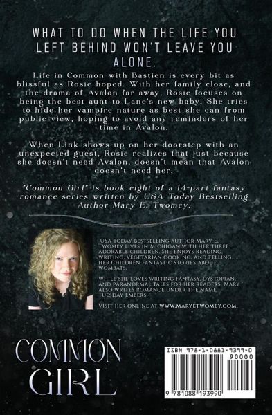 What to do when the life you left behind won't leave you alone. Life in Common with Bastien is every bit as blissful as Rosie hoped. With her family close, and the drama of Avalon far away, Rosie focuses on being the best aunt to Lane's new baby. She tries to hide her vampire nature as best she can from public view, hoping to avoid any reminders of her time in Avalon. When Link shows up on her doorstep with an unexpected guest, Rosie realizes that just because she doesn't need Avalon, doesn't mean that Avalon doesn't need her. "Common Girl" is book eight of a 14-part fantasy romance series written by USA Today Bestselling Author Mary E. Twomey.