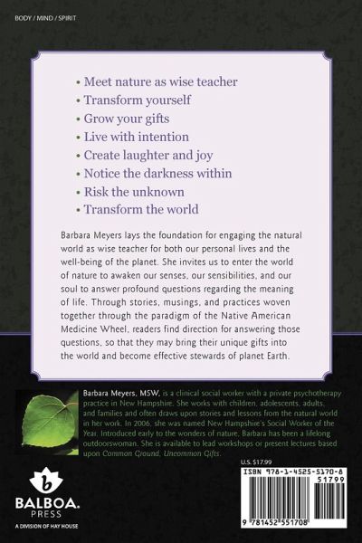 ¿ Meet nature as wise teacher ¿ Transform yourself ¿ Grow your gifts ¿ Live with intention ¿ Create laughter and joy ¿ Notice the darkness within ¿ Risk the unknown ¿ Transform the world Barbara Meyers lays the foundation for engaging the natural world as wise teacher for both our personal lives and the well-being of the planet. She invites us to enter the world of nature to awaken our senses, our sensibilities, and our soul to answer profound questions regarding the meaning of life. Through stories, musings, and practices woven together through the paradigm of the Native American Medicine Wheel, readers find direction for answering those questions, so that they may bring their unique gifts into the world and become effective stewards of planet Earth.